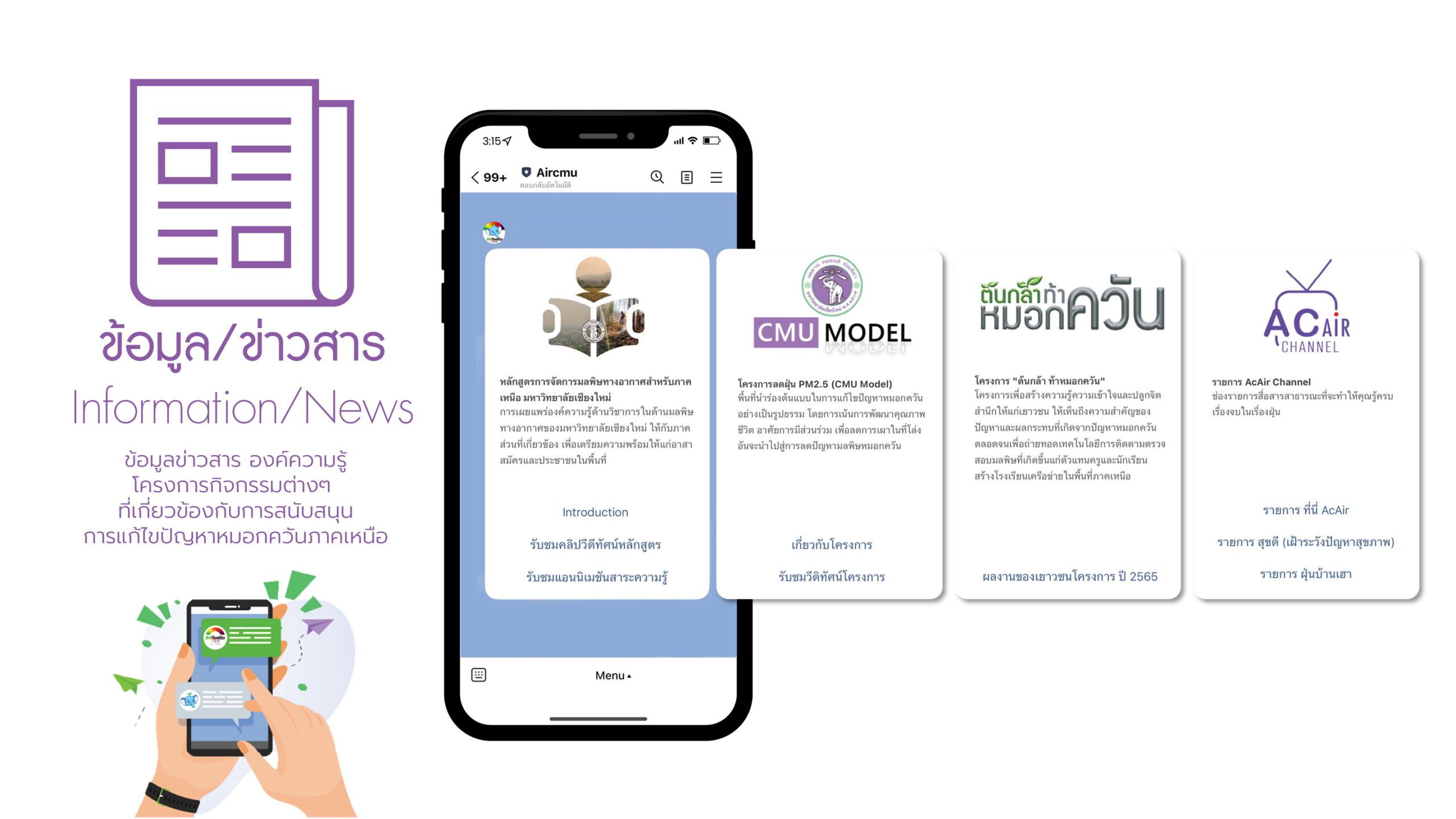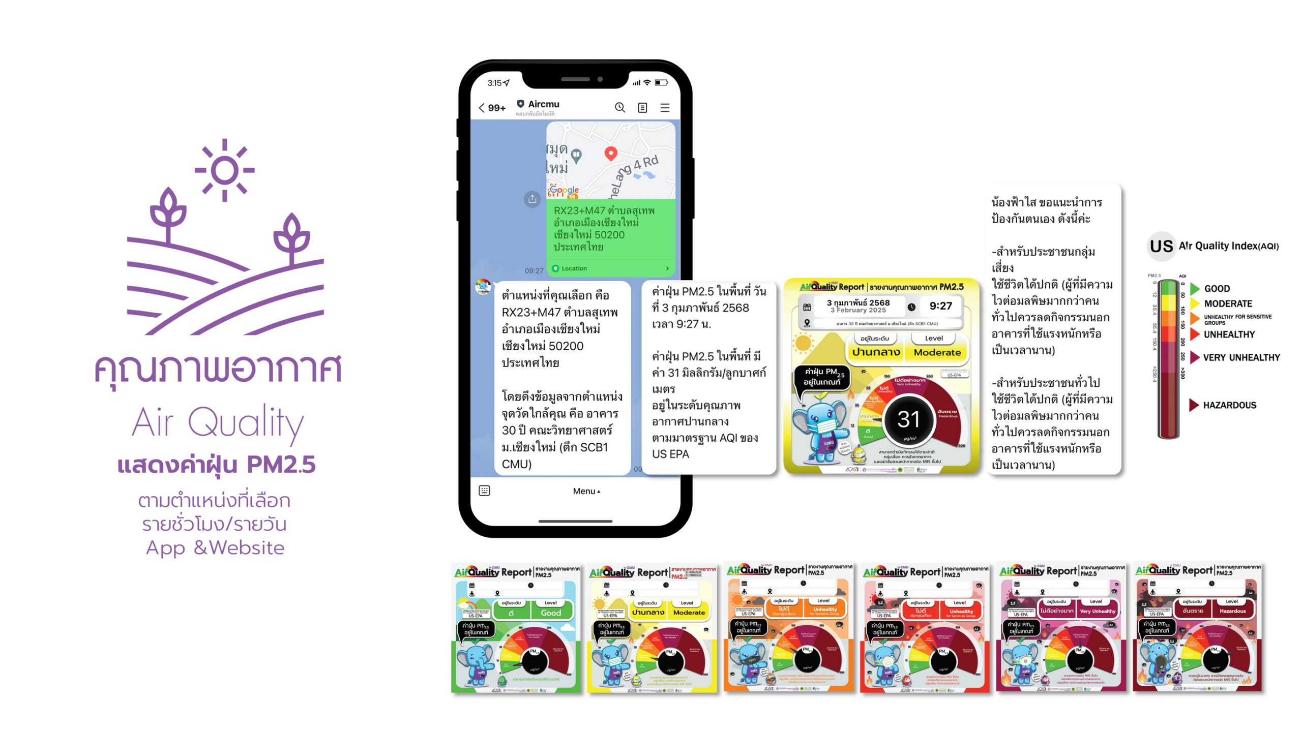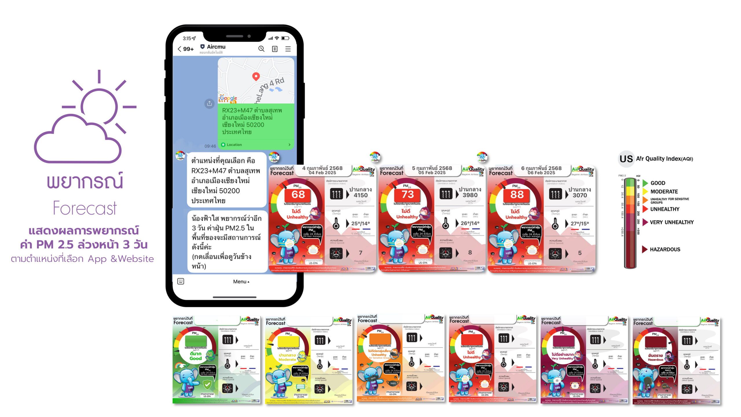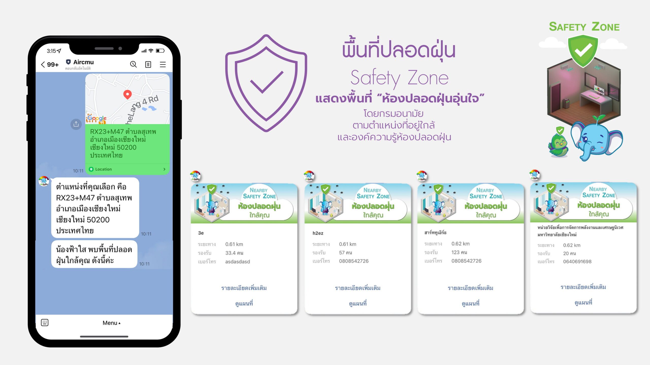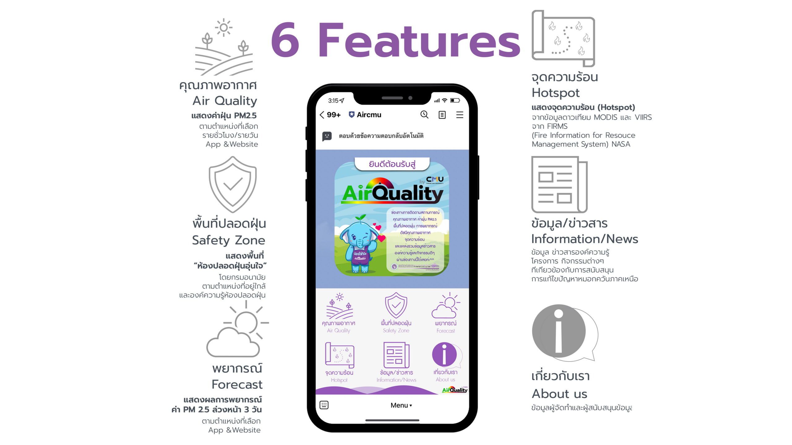 สไลด์10สไลด์11สไลด์12สไลด์13 6 FEATURES 1. คุณภาพอากาศ (Air Quality)2. ห้องปลอดฝุ่น (Safety Zone)3. พยากรณ์ (Forecast)4. จุดความร้อน (Hotspot)5. ข้อมูล/ข่าวสาร (Information/News)
